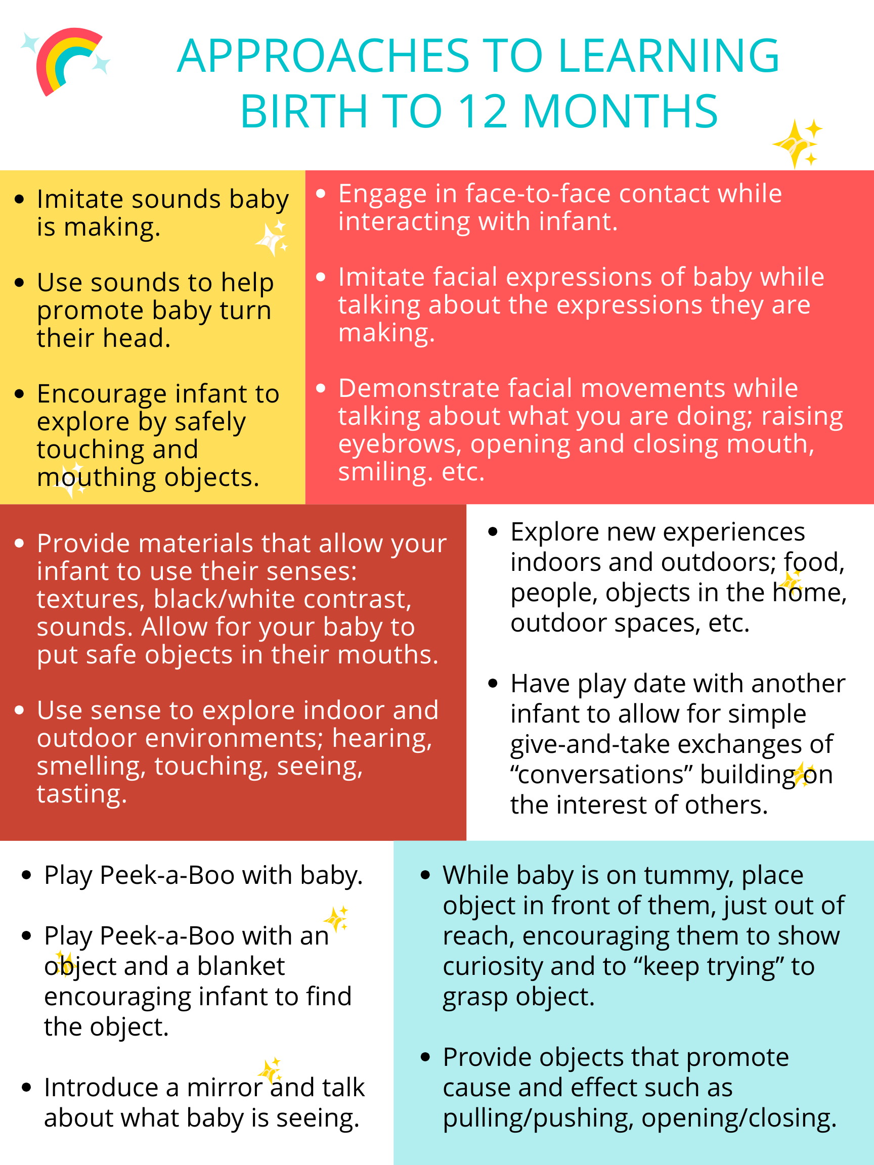 Check out these simple activities that will provide opportunities for bonding, learning, and exploration during the crucial first year of your child's life. Activities are divided by the five Domains: Approaches to Learning, Social Development and Emotional Development, Communication, Language and Literacy, Cognitive Development, and Health & Physical Development.